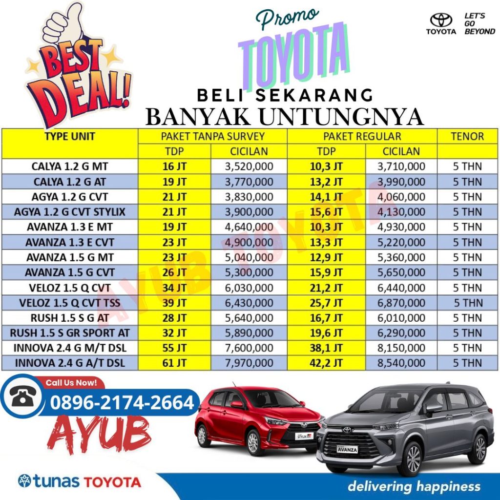 Supaya tetap Instant dan praktis, hubungi Ayub Toyota - Sales Executive untuk mendapatkan info seputar Promo Menarik dan Hadiah Spesial untuk pemesanan kendaraan melalui website ini.